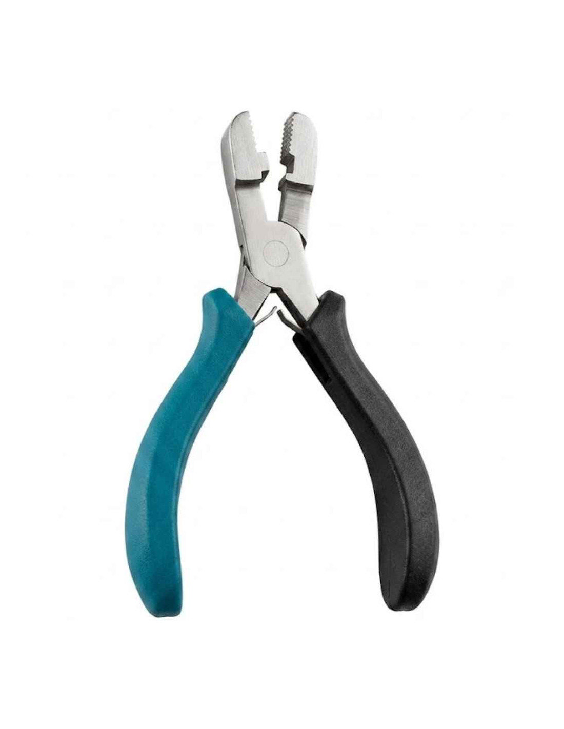 Na Remoção: Após aplicar o solvente de queratina, utilize a zona dentada do alicate para pressionar a ligação várias vezes até que esta se fragmente, permitindo a retirada segura da mecha.