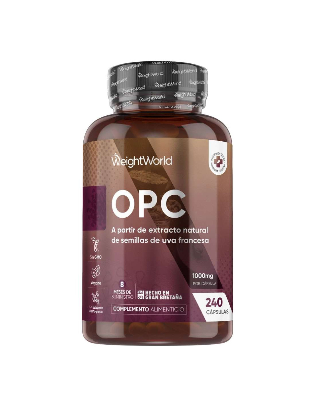 O Extrato de Semente de Uva OPC WeightWorld é um suplemento natural formulado para proteger a pele, o coração e o sistema cardiovascular através da ação antioxidante das proantocianidinas oligoméricas (OPCs). Cada cápsula fornece 1000 mg de extrato de semente de uva, com 95% de OPC (237,5 mg por dose), garantindo uma dose potente e eficaz para o seu bem-estar diário.