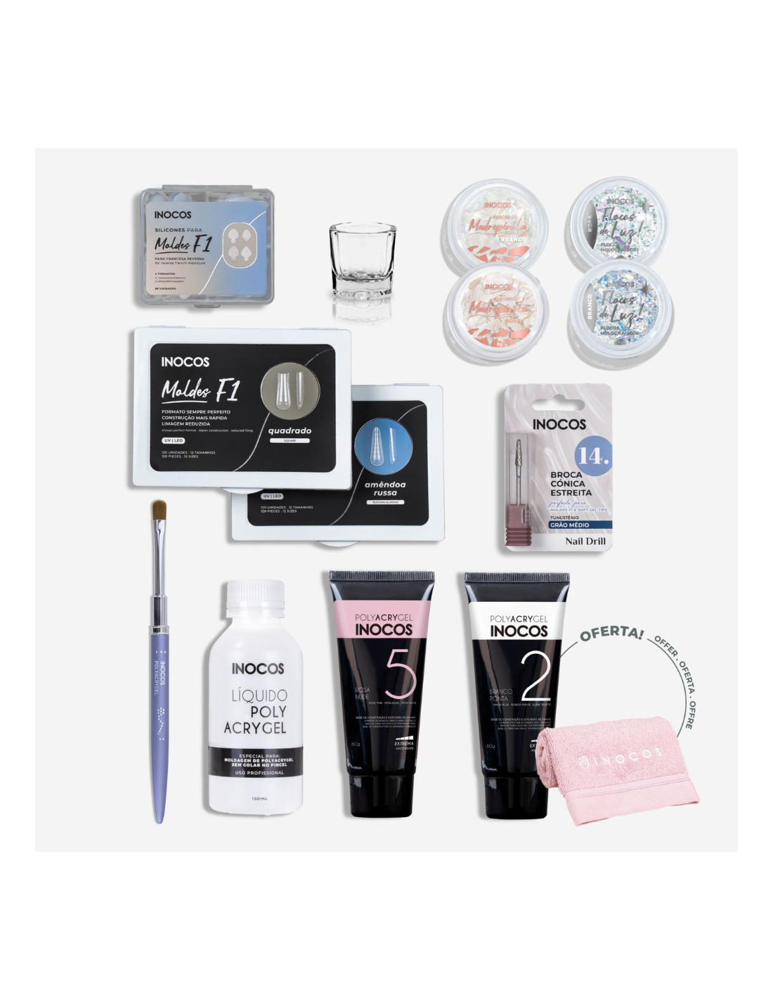 1 Formato Moldes F1 Amêndoa Russa + 1 Silicones para Francesa + 1 Flocos de Luz + 1 Madrepérolas + 1 Polyacrygel Nº5 Rosa Nude + Pincel Polyacrygel + Copo de Vidro + Broca Nº14 Cónica Estreita + OFERTA Toalha INOCOS + OFERTA Polyacrygel Nº2 Branco Ponta. Coleção INOCOS em parceria com a Nail Designer Carol Carvalho.