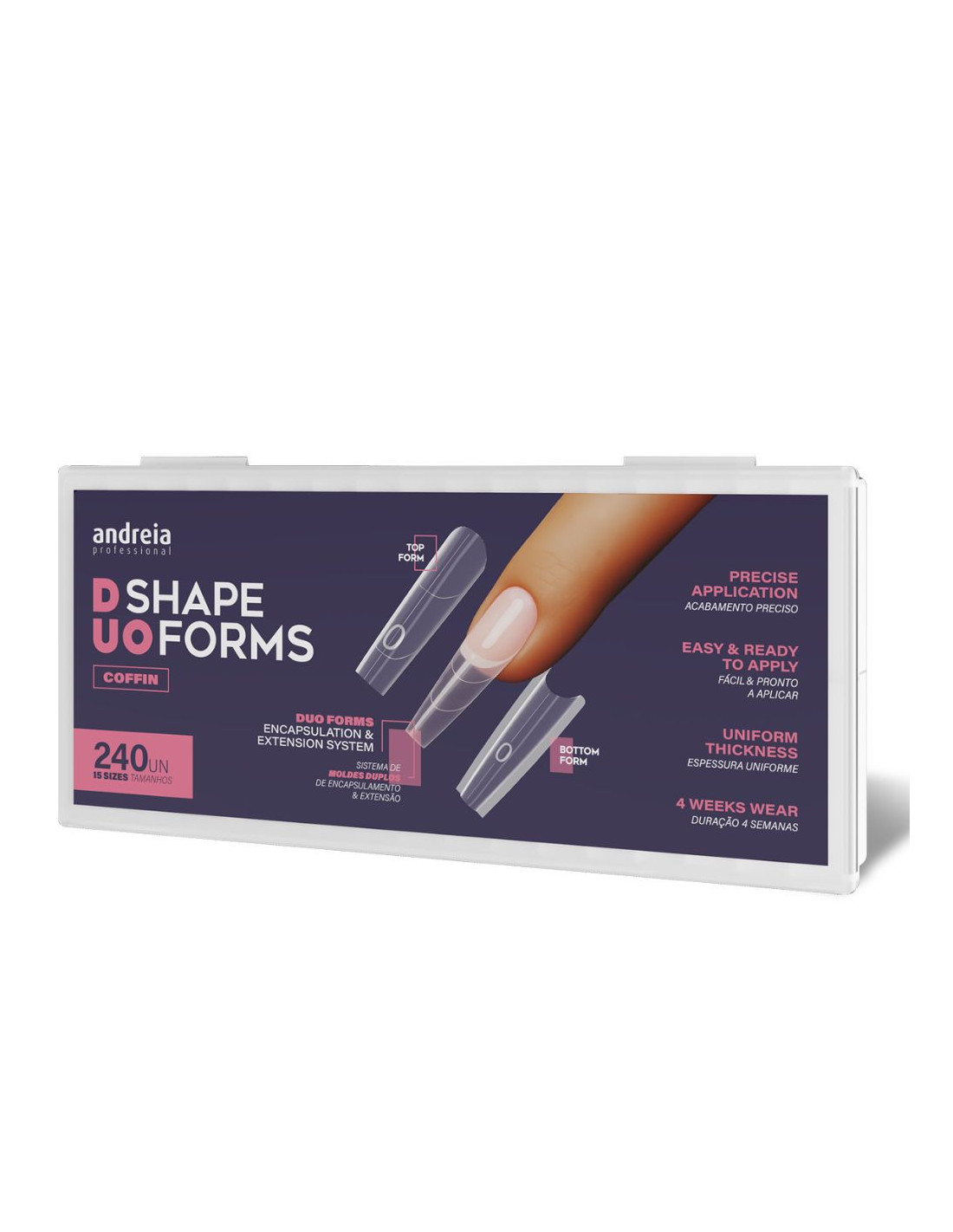 As Andreia Duo Shape Forms Coffin são moldes duplos de encapsulamento e extensão desenvolvidos para profissionais que procuram resultados rápidos, estruturados e com acabamento perfeito.