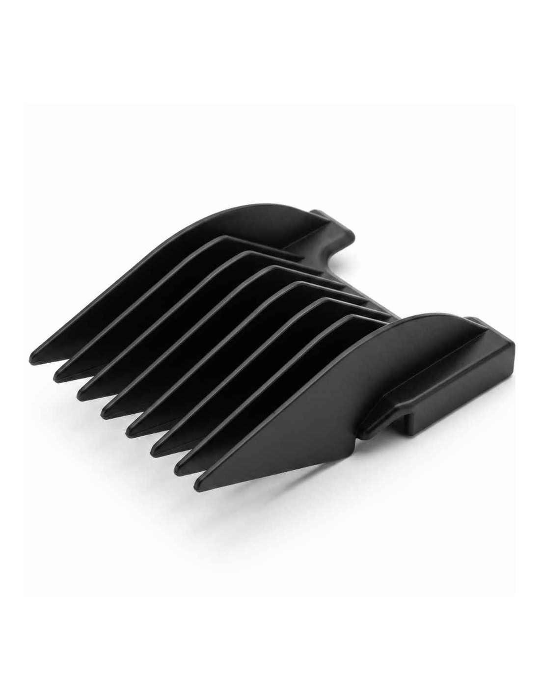 O Pente Guia de 18mm (Referência 1854-7620) é uma peça fundamental para expandir a capacidade de corte da sua máquina Moser. Esta medida específica permite trabalhar áreas que necessitam de mais corpo e densidade, sendo excelente para a parte superior da cabeça ou para laterais que não exijam um degradê demasiado curto.