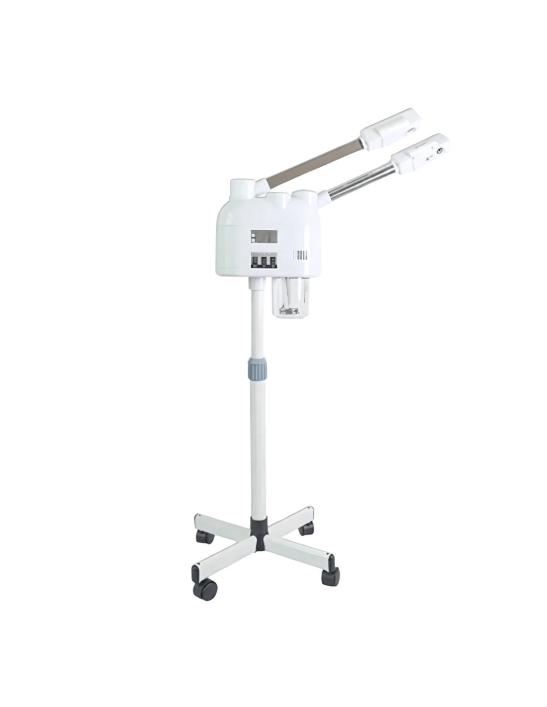 Equipado com duplo braço para tratamentos com vapor quente e pulverização fria, este vaporizador é um aliado versátil tanto para esteticistas como para barbeiros e cabeleireiros.