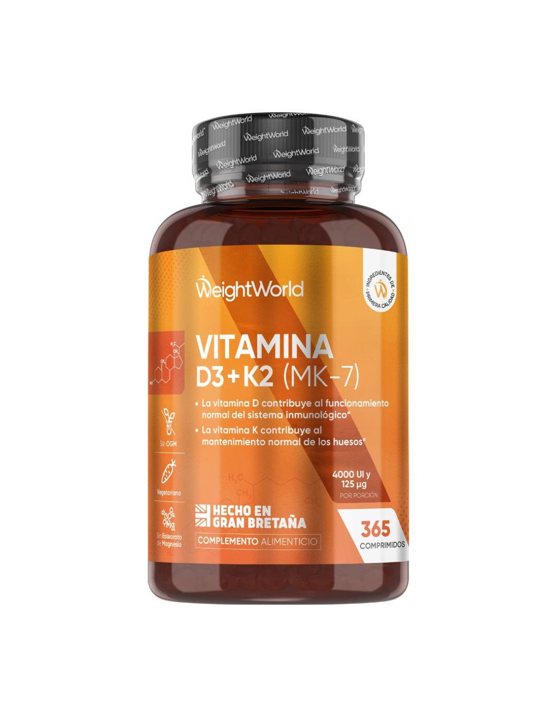 O suplemento vegetariano Vitamina D3 4000 UI + K2 125 mcg da WeightWorld combina a ação da vitamina D com a vitamina K para um suporte completo à sua saúde. A vitamina D3 contribui para o funcionamento normal do sistema imunológico, auxilia na absorção e utilização de cálcio e fósforo, e ajuda na manutenção de ossos, dentes e função muscular normais*. A vitamina K2 apoia a coagulação sanguínea normal e também contribui para ossos saudáveis*.